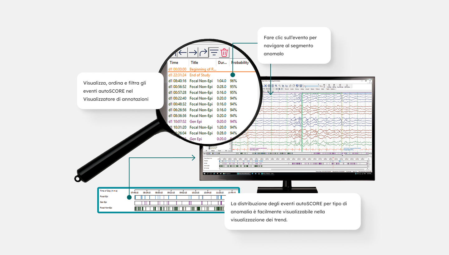 autoSCORE offre una classificazione avanzata delle anomalie EEG che va oltre i tradizionali rilevatori di picchi e crisi epilettiche. Non segnala soltanto i segmenti con potenziali anomalie, ma fornisce anche indicatori unici a livello di studio.